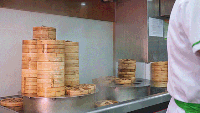 包馅的师傅可不像食堂阿姨那样手抖,每个烧麦几乎都藏着一整只明虾,师傅两三秒就包好一只。