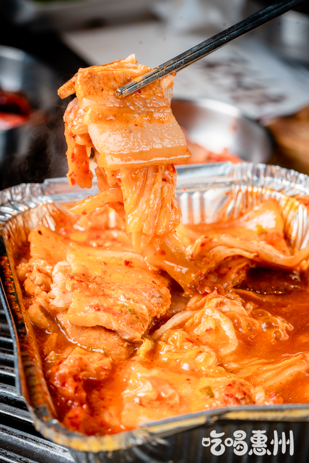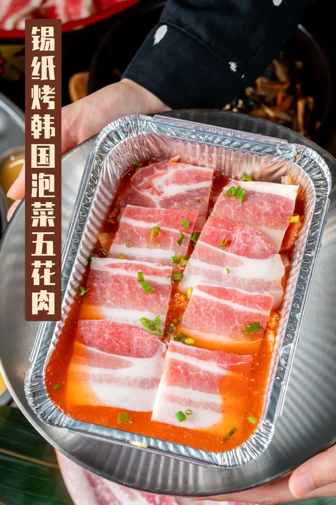 锡纸包裹的泡菜五花肉光是看着就足够馋人,将盖在底层的泡菜翻起,与五花肉一块夹着,蘸上浓郁的韩式大酱,香辣而诱人。