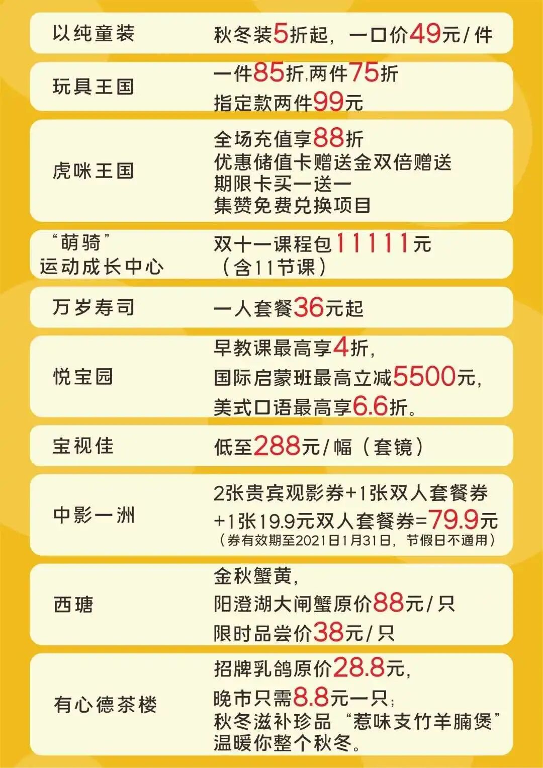 这么多折扣,双十一真的要买到爽了!等等,还没结束?即日起至11月15日,隆生广场(东湖店)线下门店25+商户都可使用11元抵60元现金券。在5折的基础上,接着减!