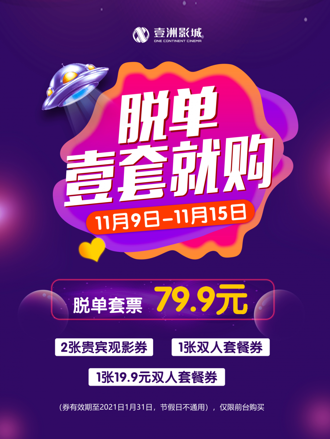 只要79.9元就能买到2张贵宾观影券,1张双人套餐券和1张19.9元的双人套餐券。快约你喜欢的女孩去看电影吧!活动时间:11月9日-11月15日哦!