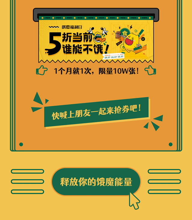 一共派发10w张【5折饿魔券】,每人限领2张、每桌可使用1张。喊上小姐妹一起领券,又能多吃几顿了~