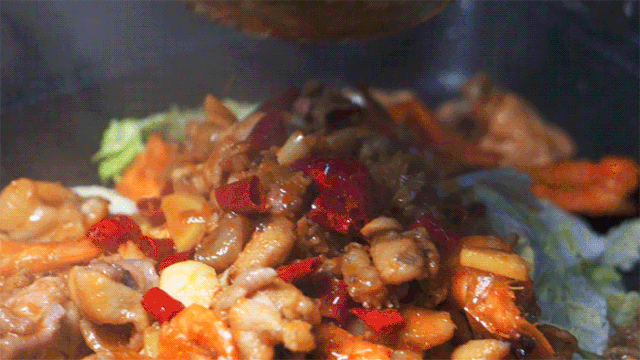 蛙肉肥美,一抿脱骨。鸡肉紧实,鲜嫩弹牙。大虾酥脆,外焦里嫩。三样待在同一锅里,这种幸福感跟单吃其中一样是无法比拟的!
