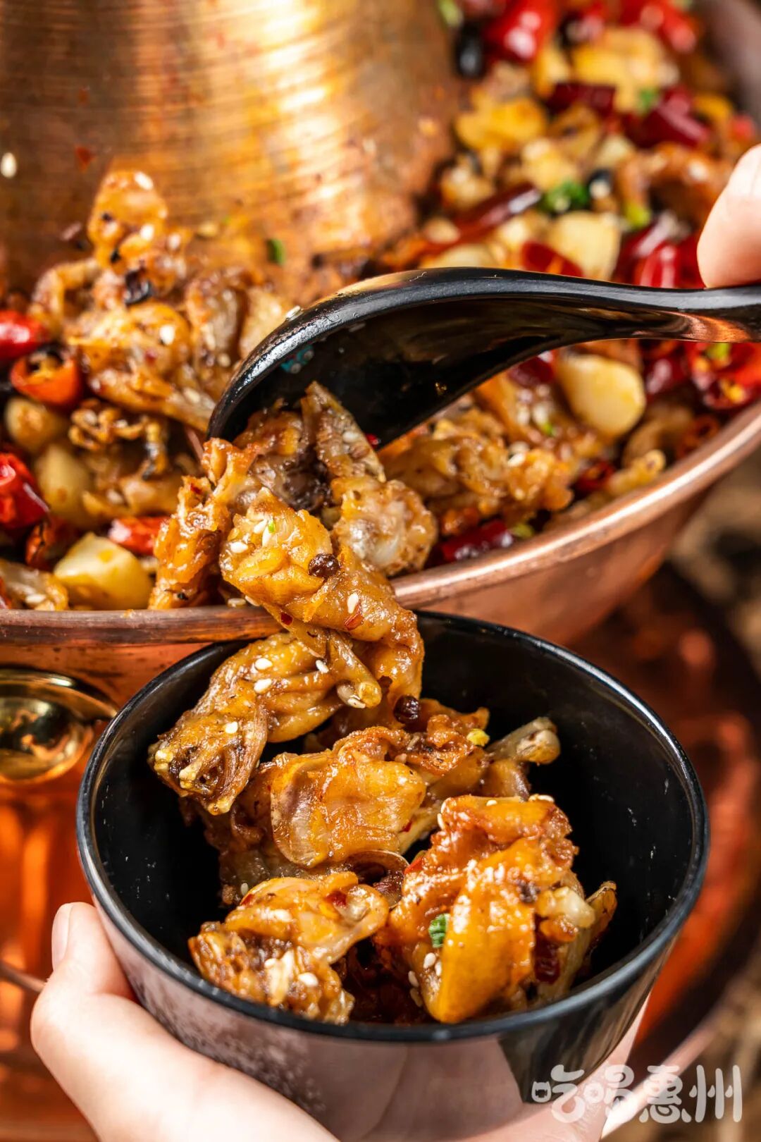 火爆抖音朋友圈小红书的网红铜锅蛙,这里也有!铜锅的好处就在于中间那一层空心炭火,更靠近锅壁的蛙肉会烤得偏干,吃起来有炭烤的香气~