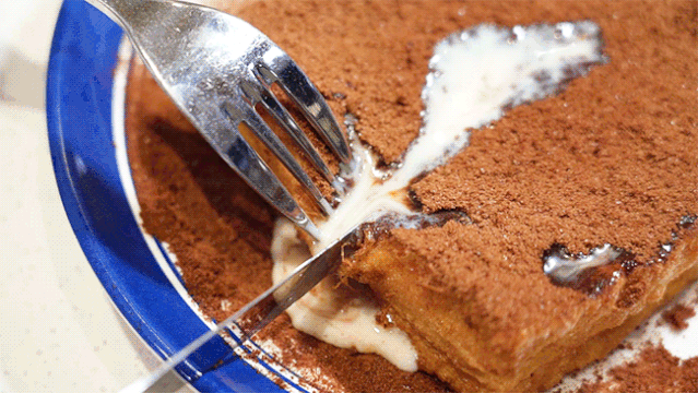切开西多士的一瞬间,炼奶与黄油如同山泥倾泻一般,顺着开口缓缓“漏”出,这“凶残的”场面,谁顶得住啊!罪不罪恶已经管不了,就算今晚要在健身房多待2个小时也要吃它!