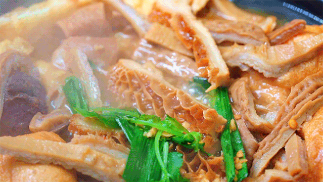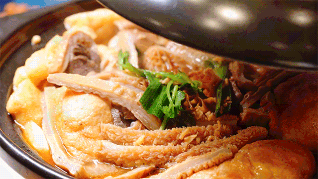看看这煲满满当当的牛腩、牛脆骨、牛筋、牛肚、牛肠、牛肺……色泽金黄,越煮越香,汤汁的精华全都渗透在食材里,每一口都让人神魂颠倒。