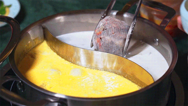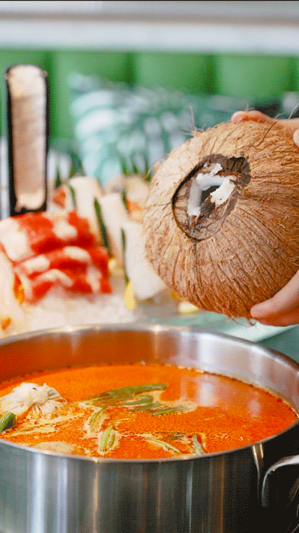 鸳鸯锅的另一半,新鲜椰子汁水和泰式冬阴功锅底的神仙搭配,集酸、辣、鲜于一体,汤好喝到爆炸!