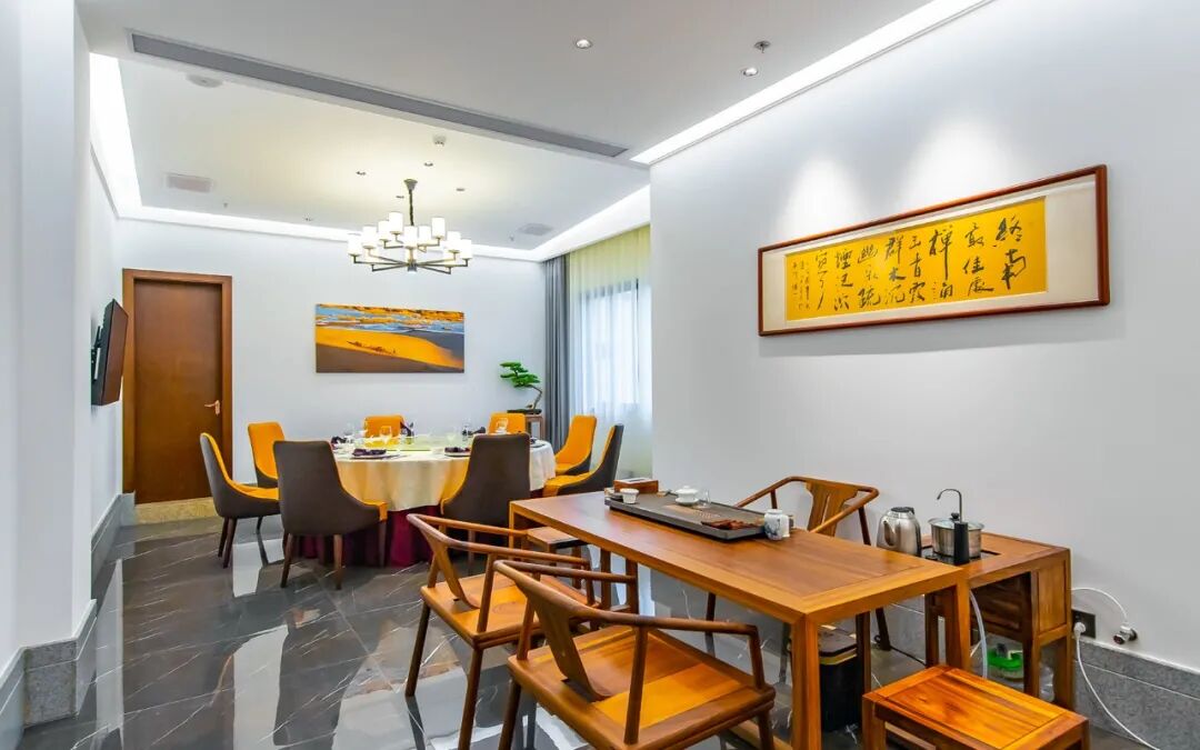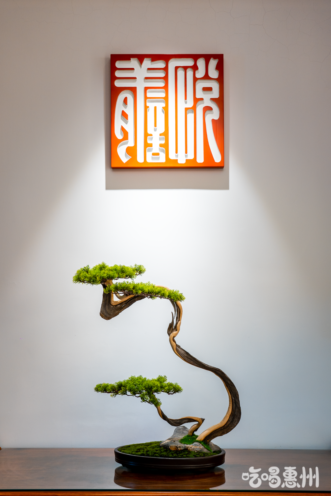 包间里配有高端胡桃木茶台、独立洗手间,墙上悬挂大师级的画作、摄影作品等,并且摆放造型独特的崖柏盆景,给你带来一场艺术与美食的碰撞。