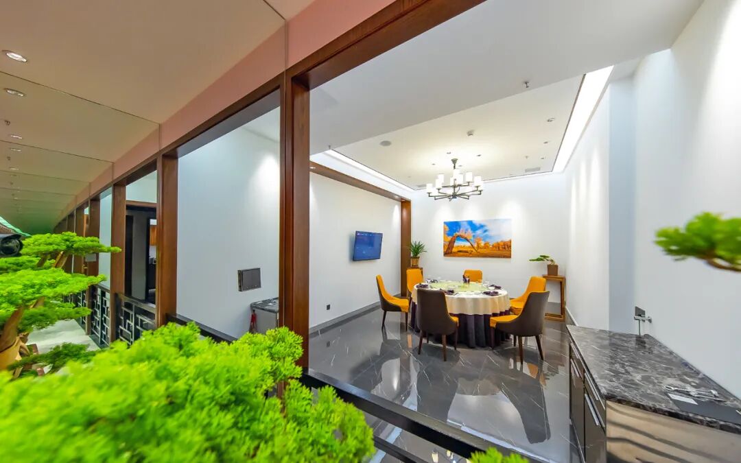 沿着长廊一直走到底,每个包间都有不同的风格设计。最大的宴会厅可以容纳60-70人,适合各种宴席招待、主题活动。