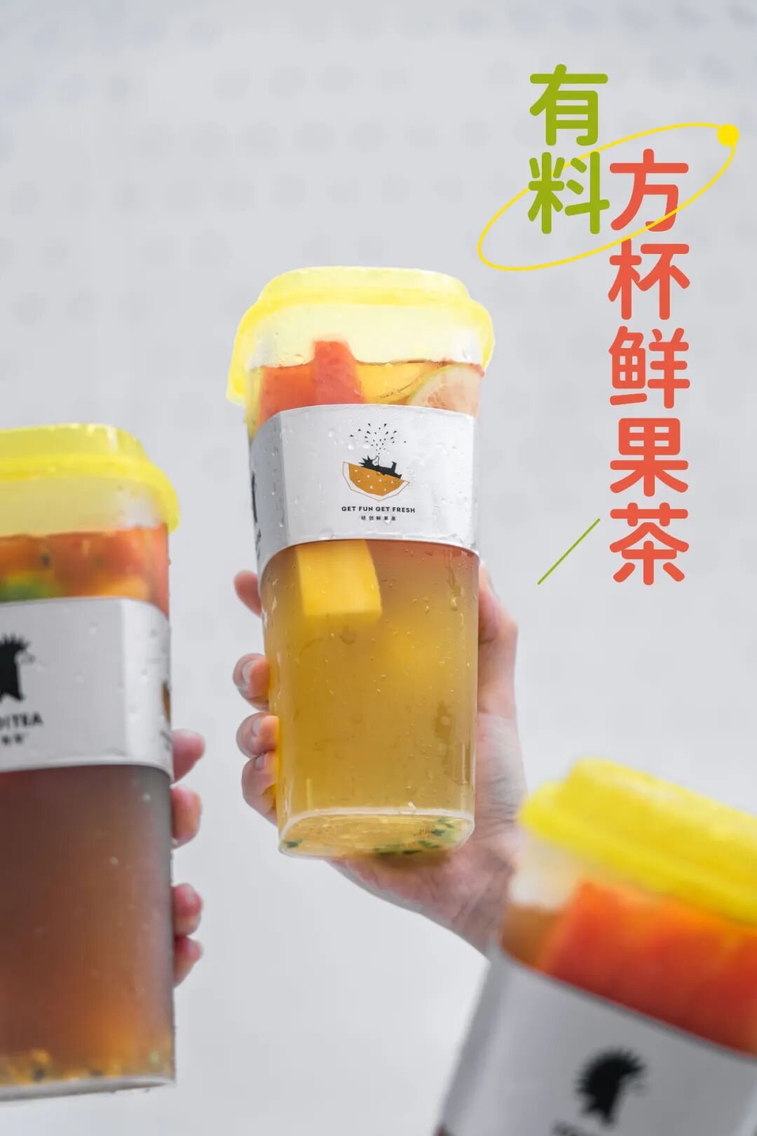 招牌鲜果方杯有红茶、绿茶、青茶三款茶底可选。红茶醇厚浓郁、绿茶清新回甘、青茶草本馥郁。