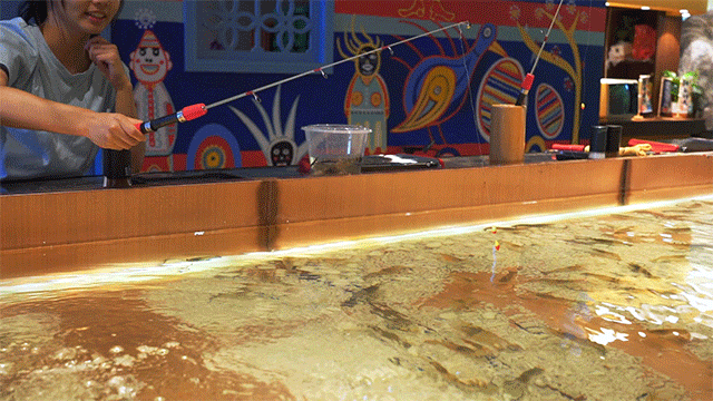 握竿者一时间既兴奋又紧张,眼看着“猎物”就在眼皮子底下,却要耐心等待它上钩,感受到钩子的重量时,再将其一把钓起,随之而来又是一阵雀跃。