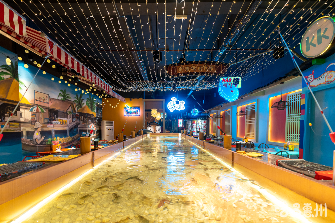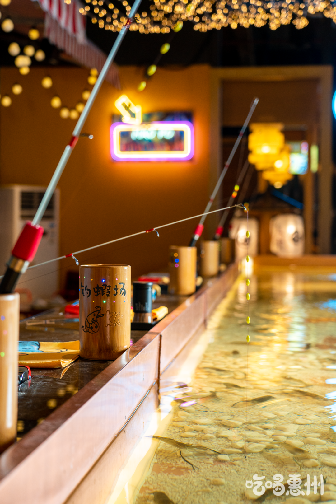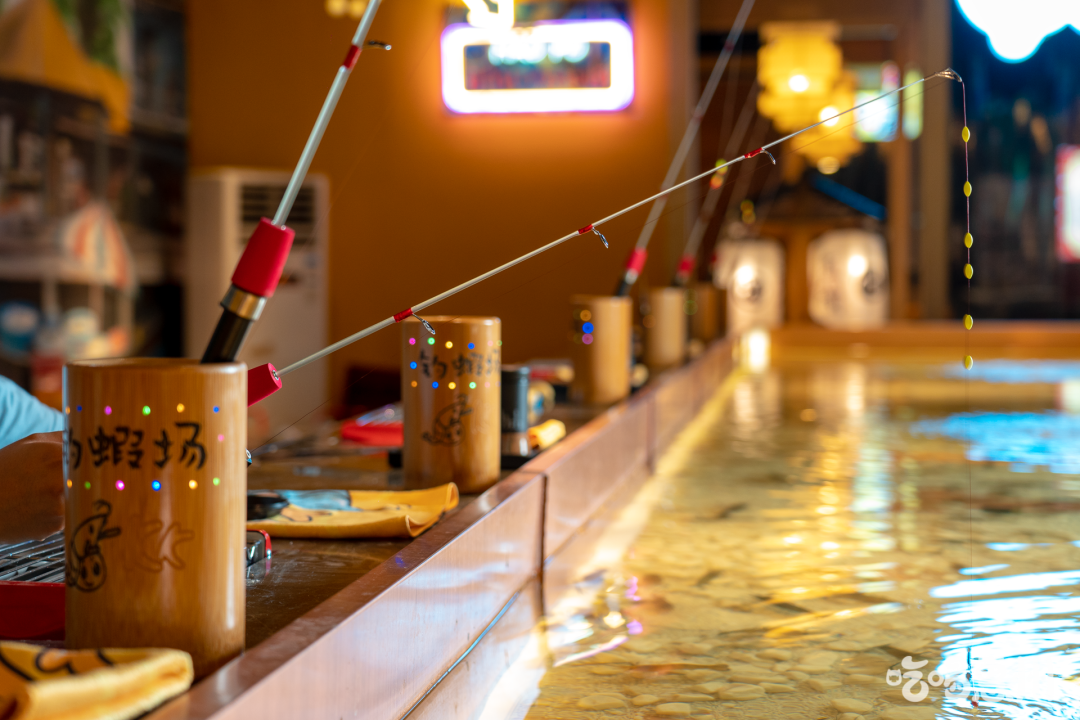 暖黄的灯光照映之下,池水泛着微微波光,静坐于池边垂钓,仿佛所有欢乐都能在这儿找到归宿。