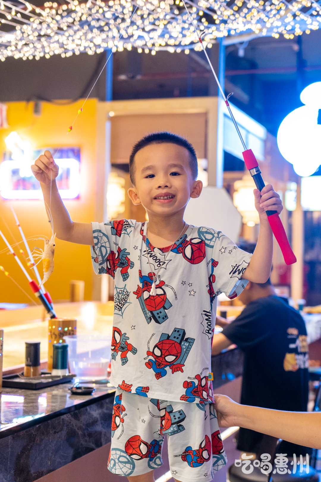 拍摄那天我们在KK玩了一整晚,遇见在钓虾池边玩得很欢乐的小朋友,他的母亲在身边用手臂将他小心翼翼地护住,跟着他钓虾成功的喜悦一同露出幸福的笑。
