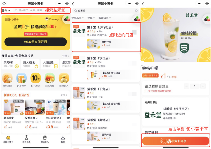 点击上方按钮进入小黄卡首页,搜索?益禾堂,找到附近门店,购买1元饮品!