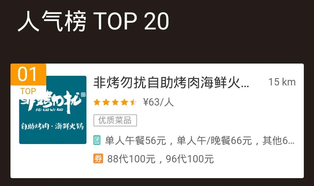 作为全能型的自助烤肉火锅一体化餐厅,非烤勿扰妥妥的占据了某团美食人气榜的第一名。