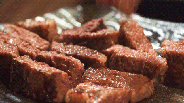 先给大家介绍的是M9+牛排,可以看到牛排的脂肪分布均匀美观,直接放到镂空的烤架上开始烤制。7成熟,咀嚼感很是实在。