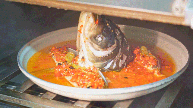 它家翘嘴鱼头能火上12年,主要归功于秘方腌制3年的封坛剁椒,才能腌制出如此独特的味道!使得鱼肉坛香浓郁,口感极佳。