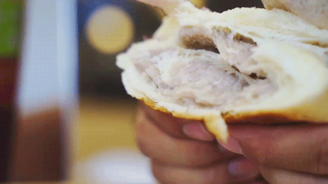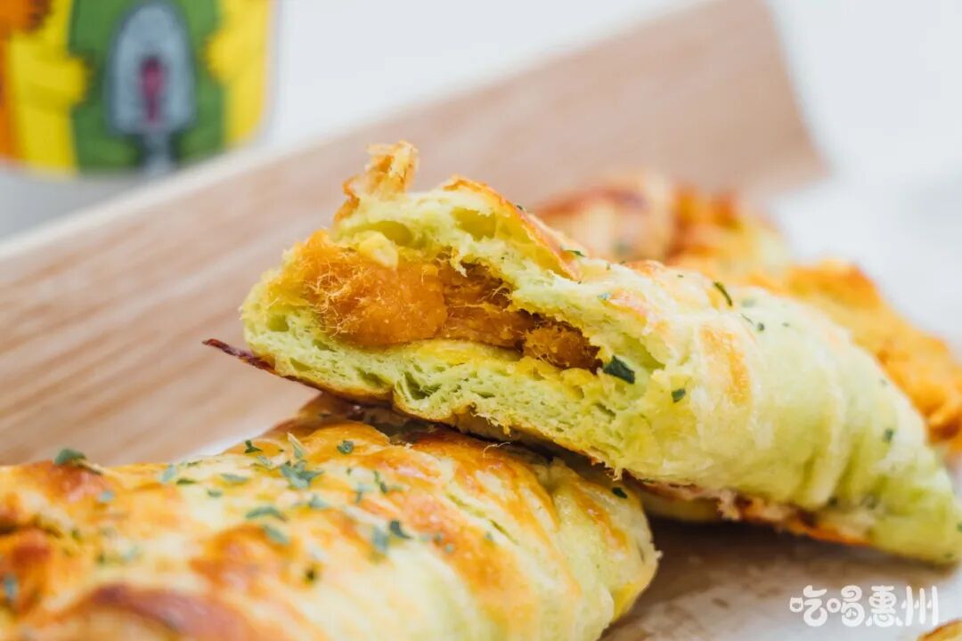 菠菜肉骨头表面是芝士和烘烤的肉松,内含还有一长条的肉松馅,面包体用了菠菜汁上色,口感蓬松,肉松星人不能错过!清欢乌龙搭配双层肉松的咸口面包,完美!
