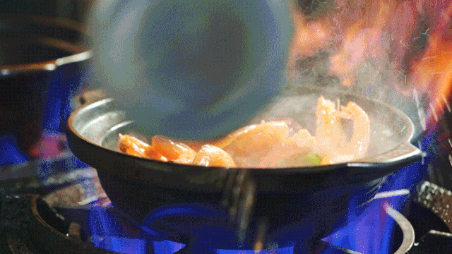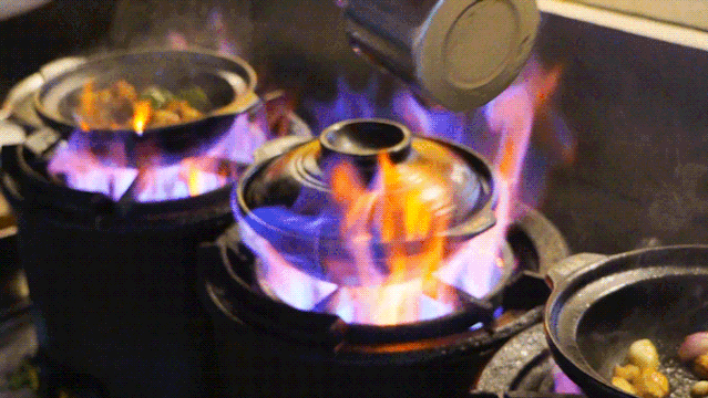 掌棍的主厨是前米其林一星餐厅的主厨,据说已从业20+年了。手持着长达近半米的啫棍,在三个高达400℃的啫煲之间来回的搅拌,功夫火候杠杠的到位。