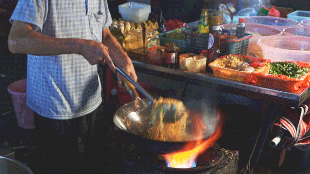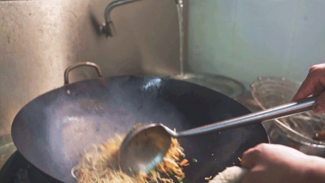 看似简单的鸡蛋火腿配料,实则不易。炒米粉最讲究火候的把控,在食客多的宵夜点,很是考验师傅的腕力和翻炒速度。