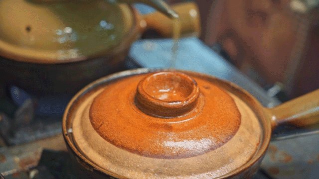 中间只开两次盖,一次放菜,一次加自制酱油。中途还要沿煲边浇一圈香油,并且适时旋转砂煲,让煲底均匀受热。