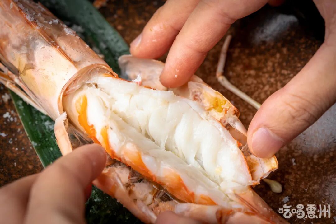 剥开虾壳,便能看到饱满的虾肉。再滴上几滴金桔汁,虾肉的肥美就能体现得淋漓尽致。