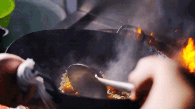 大排档的魅力就在于万物皆可大火翻炒!刚出锅的油条炒蚬肉带着热气与香味一同席卷而来,要趁热吃!