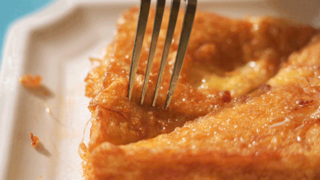 两片吐司中间夹杂着花生酱,外层挂满蛋液炸得酥脆