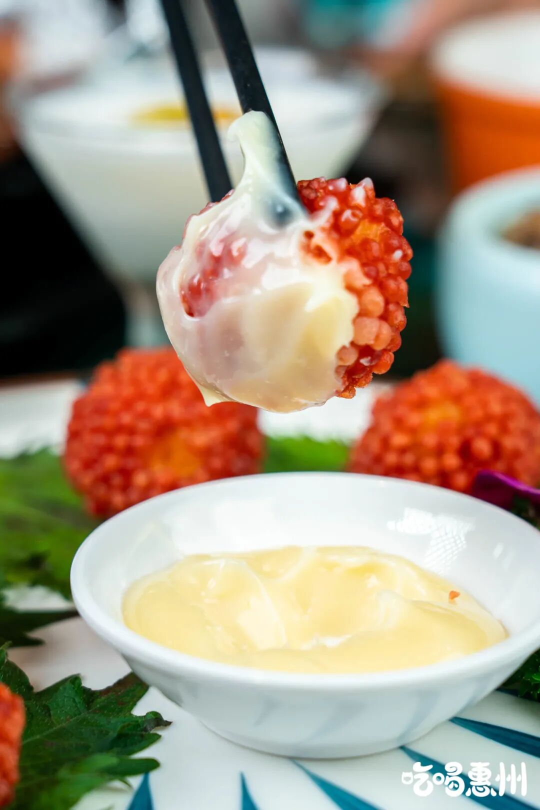 荔枝虾球,如它的名字一般,形似荔枝,内裹虾滑。搭配上店内特调的芥末沙拉酱,甜与芥辣中和得恰如其分!