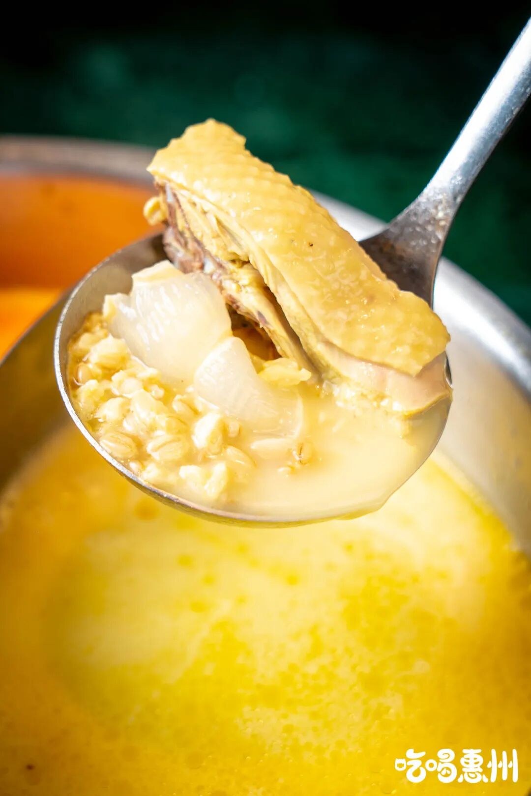 一半是加入泰式香料包,倒入一整个新鲜剥开椰子的汁,一半是放入花胶、燕麦和鸡肉。冬阴功的酸辣味和花胶鸡的滋补甜味在舌尖上碰撞出不一样的新奇感。