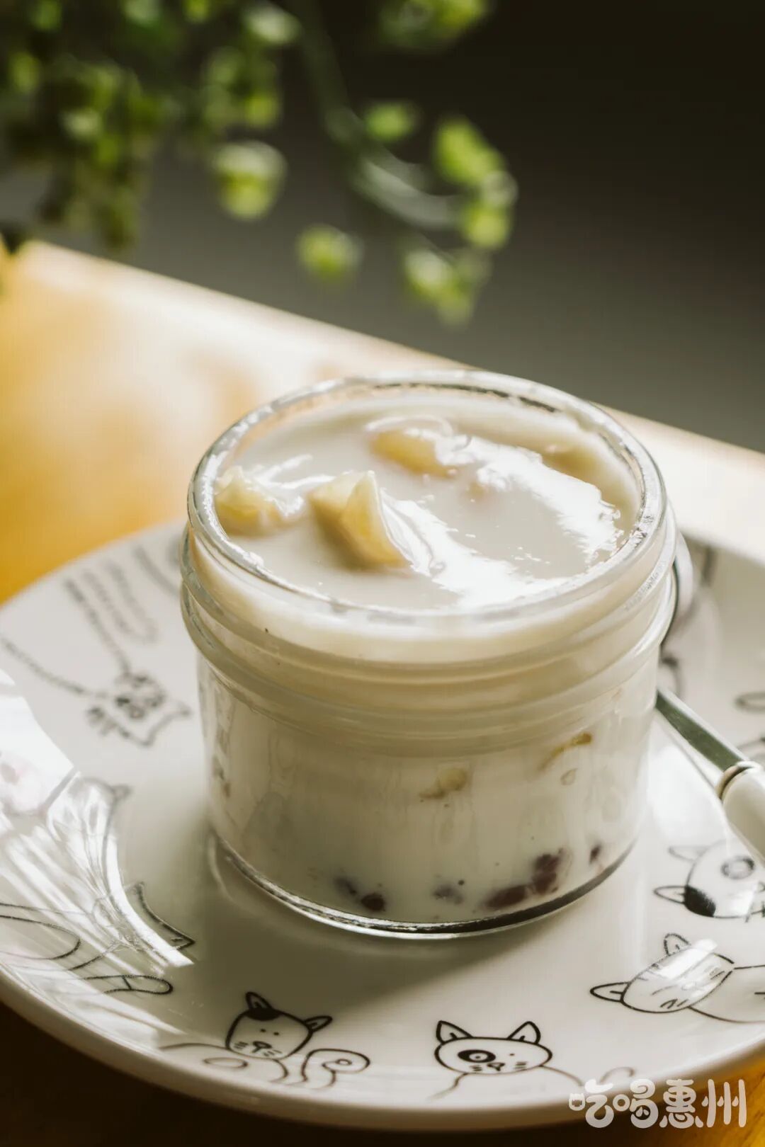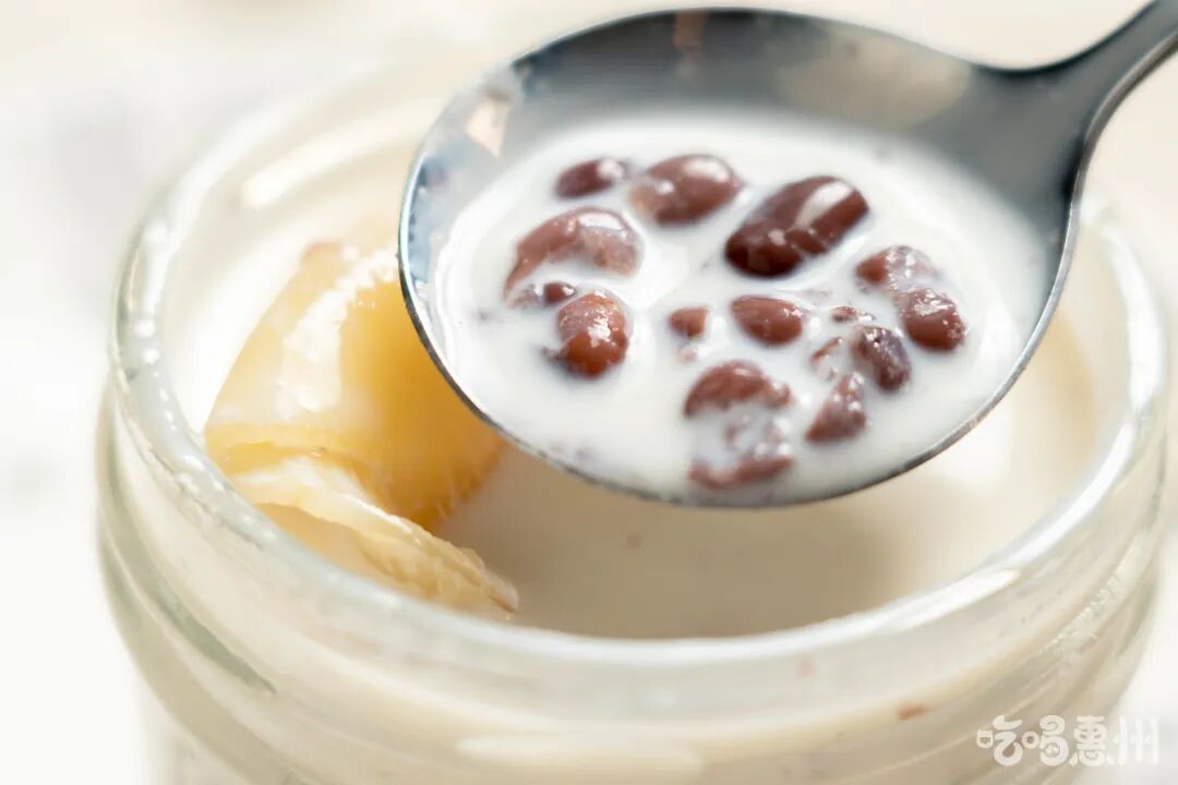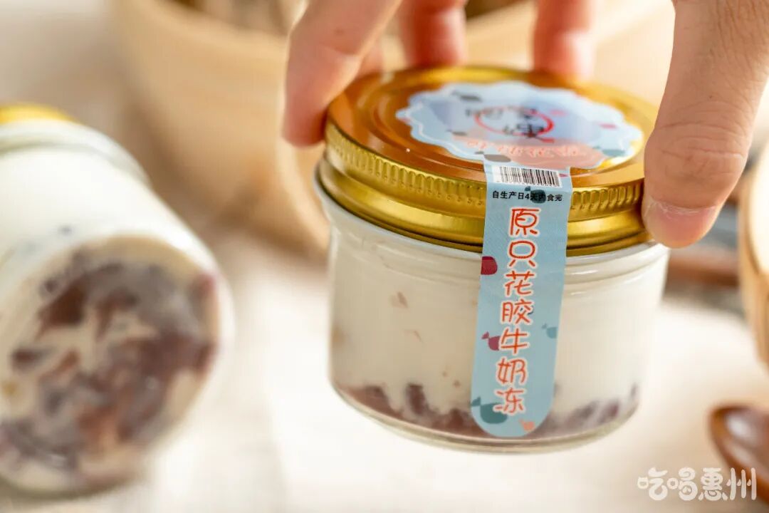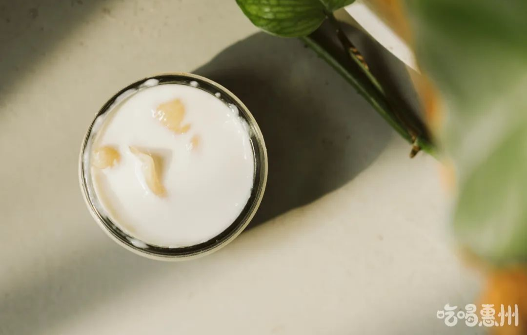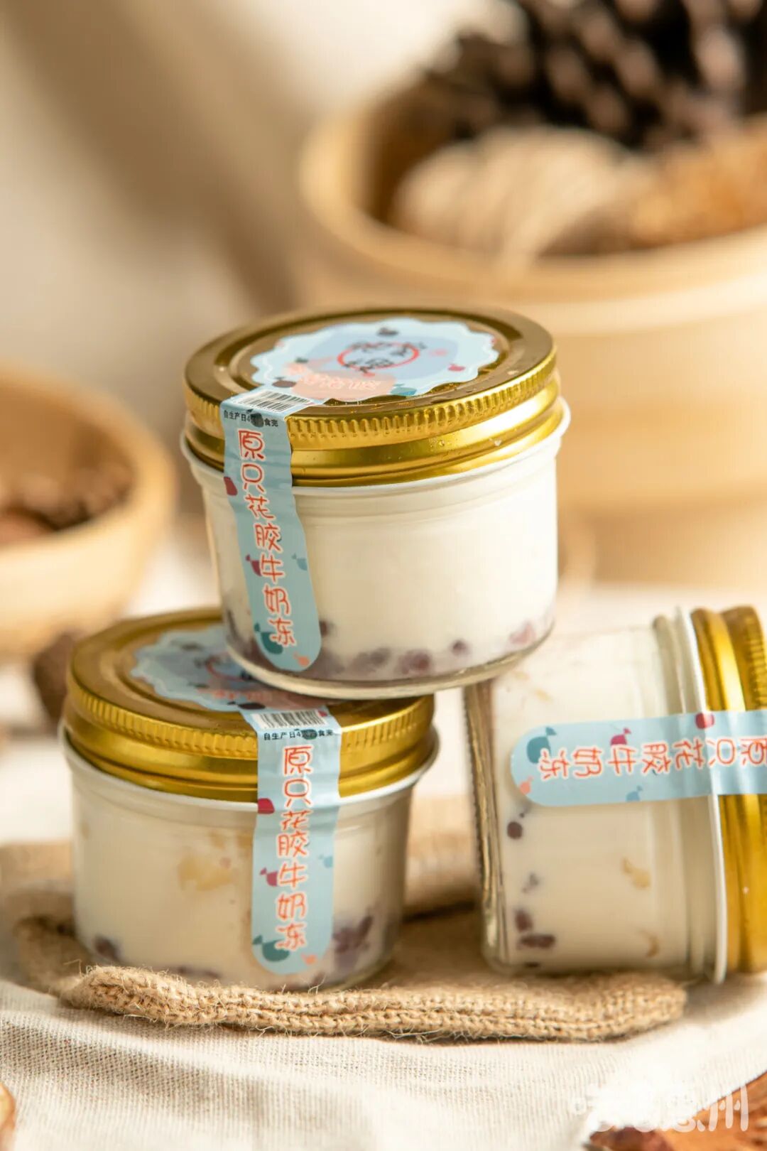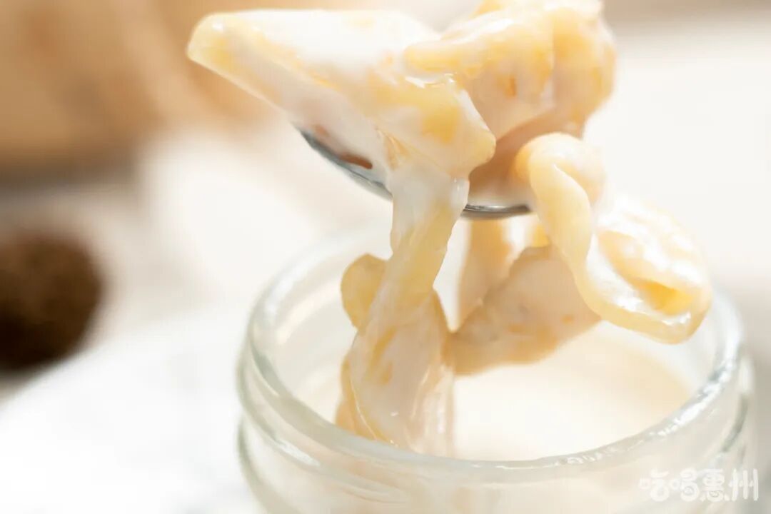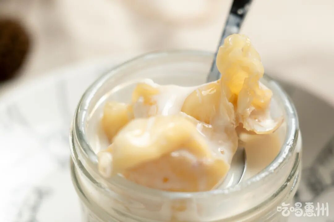 揭开盖,就能看到布满瓶面的花胶,还有股浓郁的奶香味,甜度适中,超适合夏天吃!