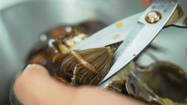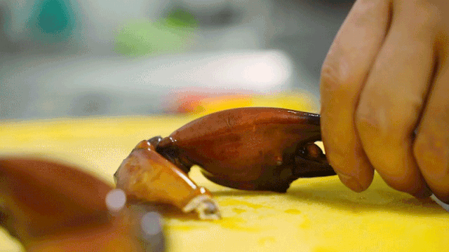 新鲜活蟹现捞现杀,为的就是吃得放心。剪线、分四瓣、刷壳、敲敲更入味~