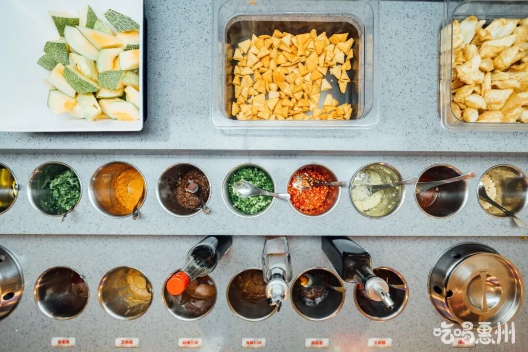 店内设有酒水区、配料台、水果,食客可以自行调配喜欢的火锅酱料~
