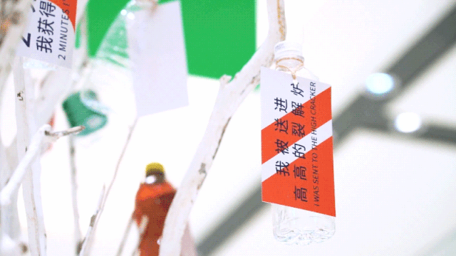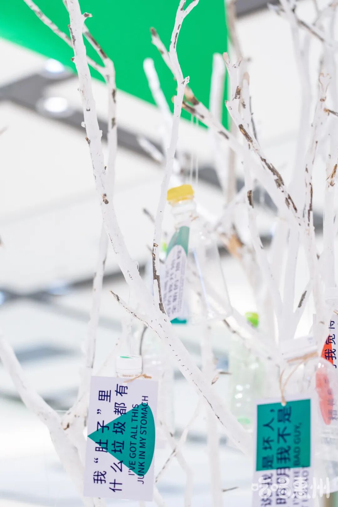 这是由回收的塑料瓶子做成的珊瑚树,每一个塑料瓶子上都有一句悄悄话。