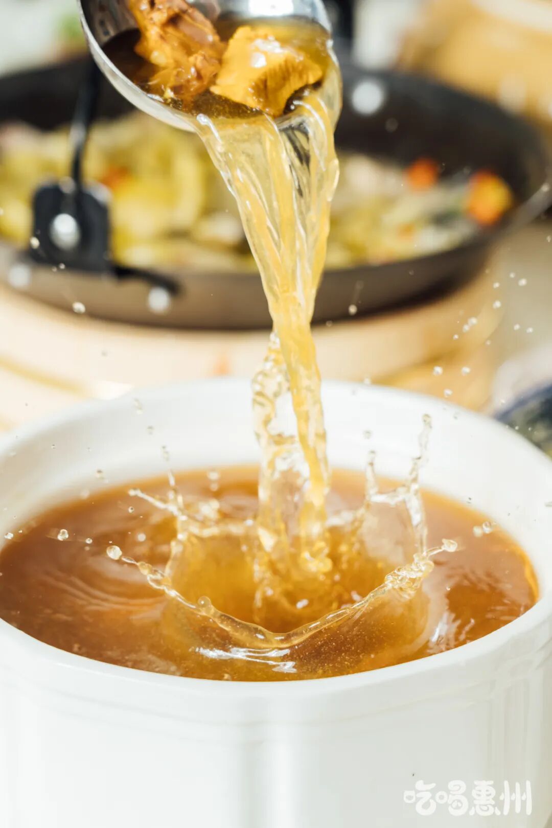 梁化大阉鸡又称八斤鸡,每只肉肥硕美。老师傅会用特制的汤底小火熬制足足6个钟,汁多肉肥,开炉便能闻到一股浓厚的鸡香。