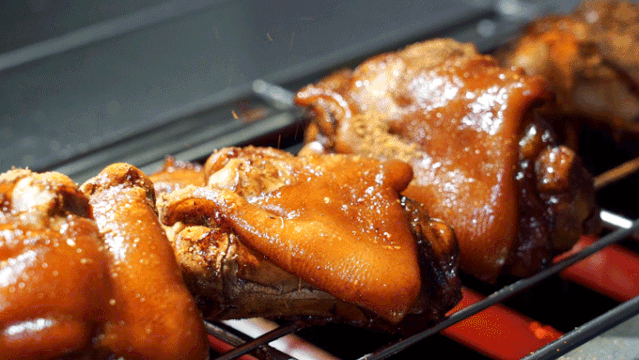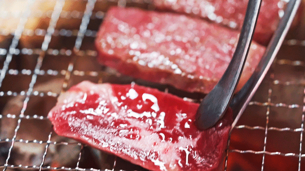 ▨ 先来一片新鲜牛肉,淋上酱料,炙烤 ▨