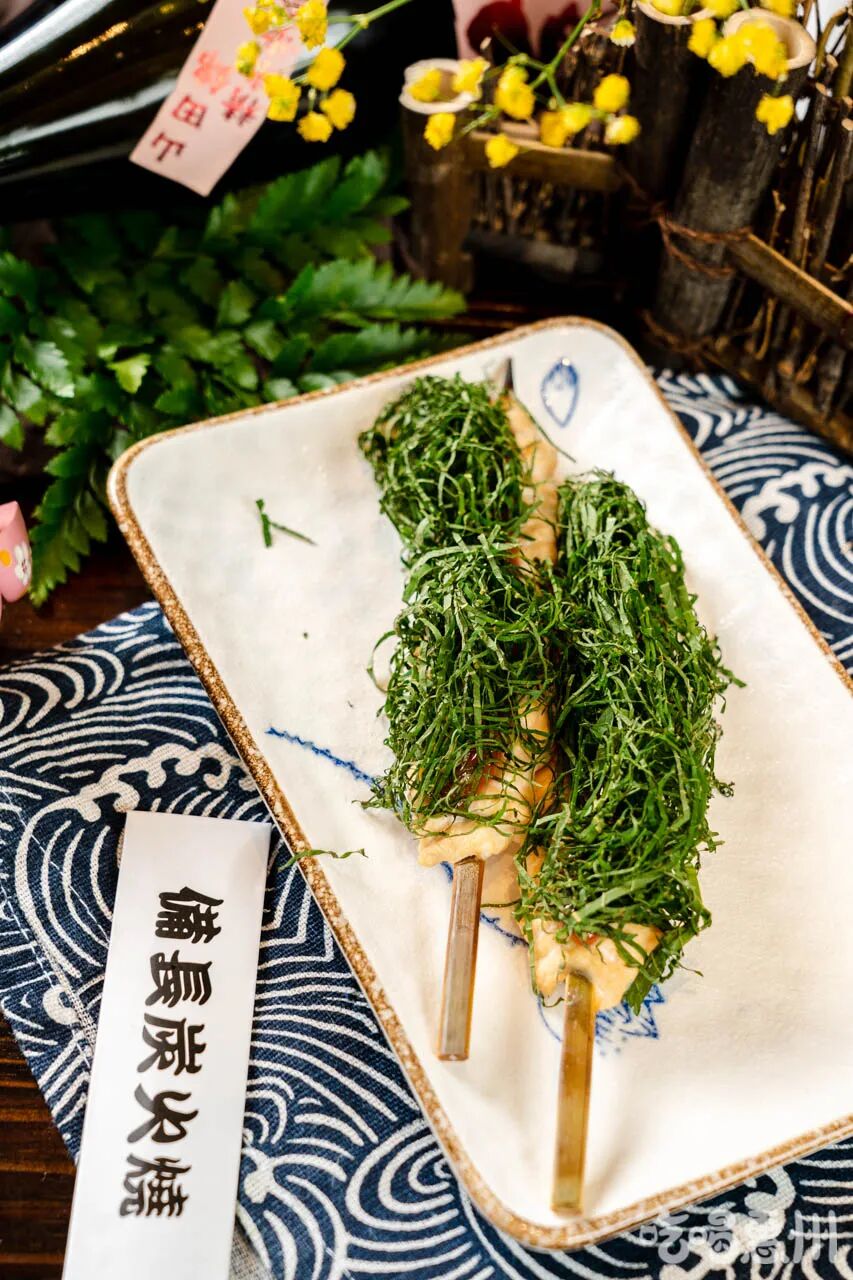 梅酱涂在鸡胸肉中部,摆上紫苏。这道烧鸟的味道层次最为丰富,鸡胸肉被紫苏香气覆盖,梅酱酸甜解腻…记得趁热吃!