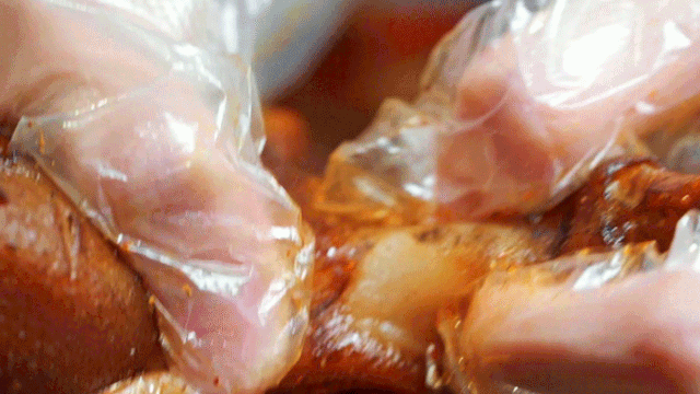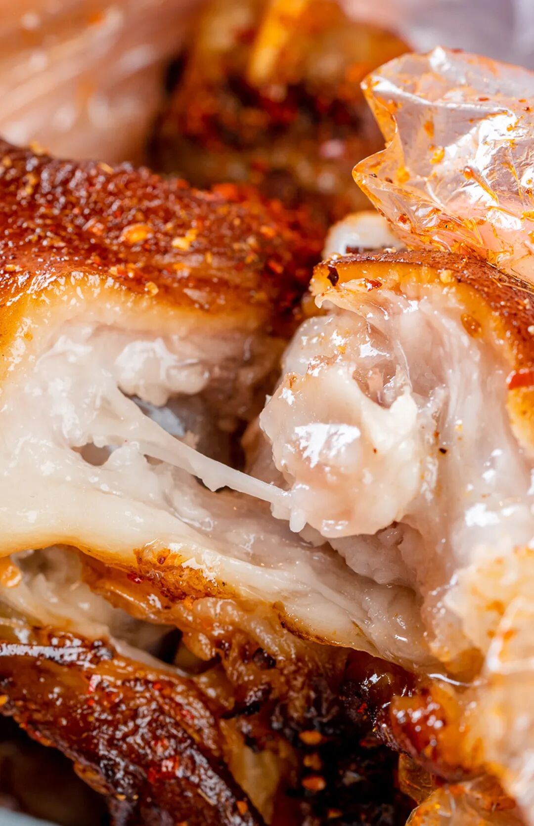 猪手现点现烤,师傅熟练地刷上一层油之后,再撒上辣椒粉和孜然粉,这你都能忍?