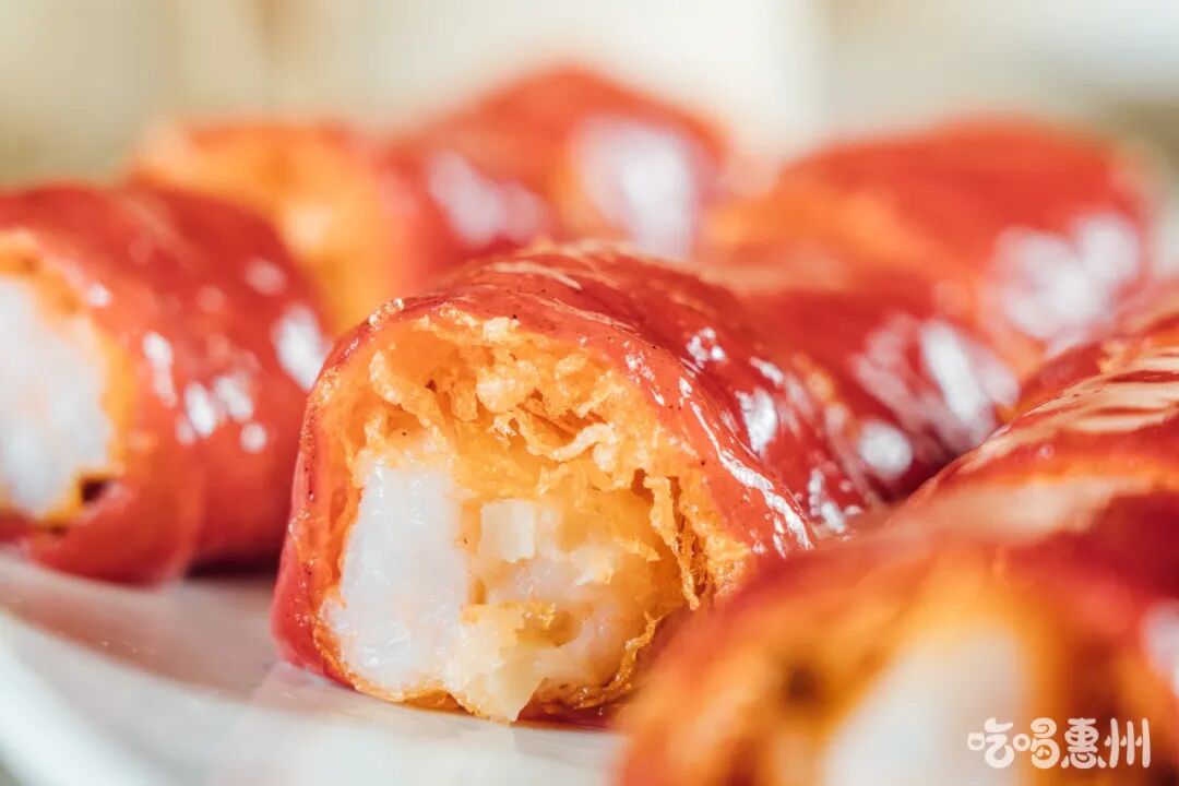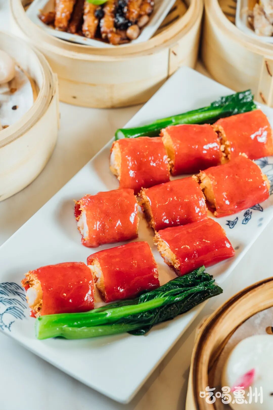 红米肠是广府人的心头爱。红米皮软滑薄,夹层金黄酥脆,大虾完整饱满。爽脆的夹层酥平衡了整个米肠的油腻,配以鲜虾带来微微的嚼劲,可谓一口封神。