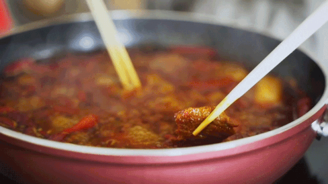 啊啊啊,看着我最爱的麻辣锅来了!熟悉的辣椒干香扑鼻,牛油加持的麻辣鲜香,一沸腾我就欲罢不能了…
