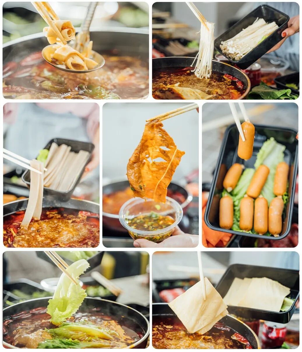 4种汤底选择,分开打包,不只是日常的葱花香菜小米椒,其他蘸料也可选择,还送新鲜水果(已经被胖虎吃完了)。拿到手后通通怼入锅里等待麻辣的翻滚!