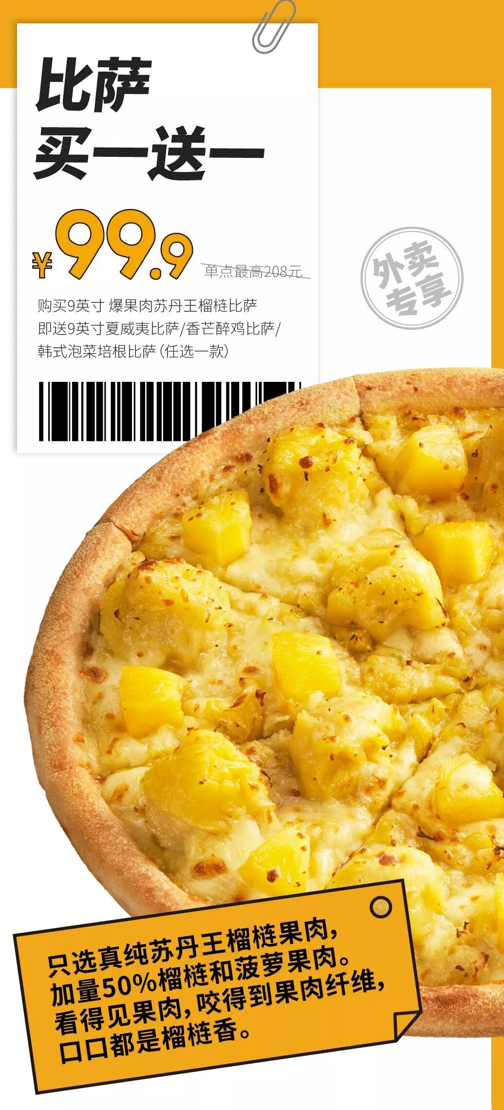 比萨买一送一,购9寸爆果肉苏丹王榴梿比萨,送9寸夏威夷比萨/香芒醉鸡比萨/韩式泡菜培根比萨任选一款,仅需99.9元(单点最高208元)。