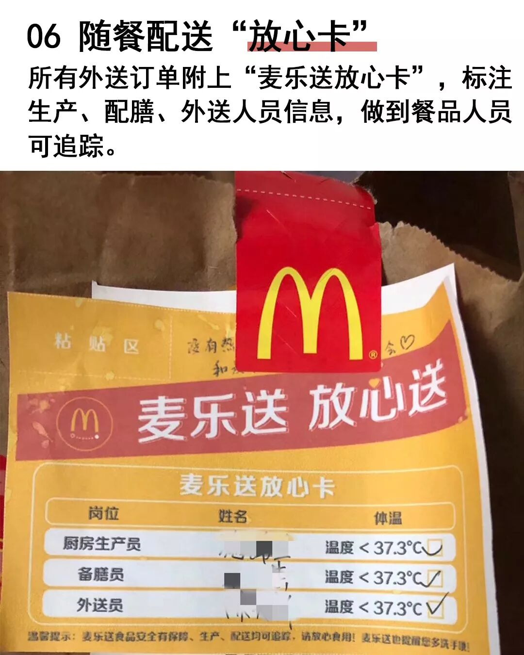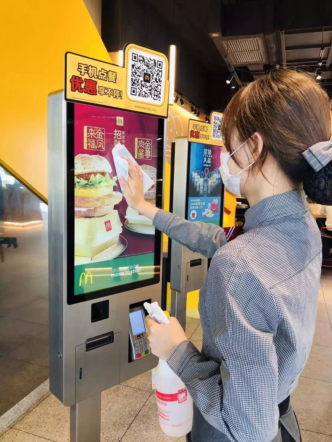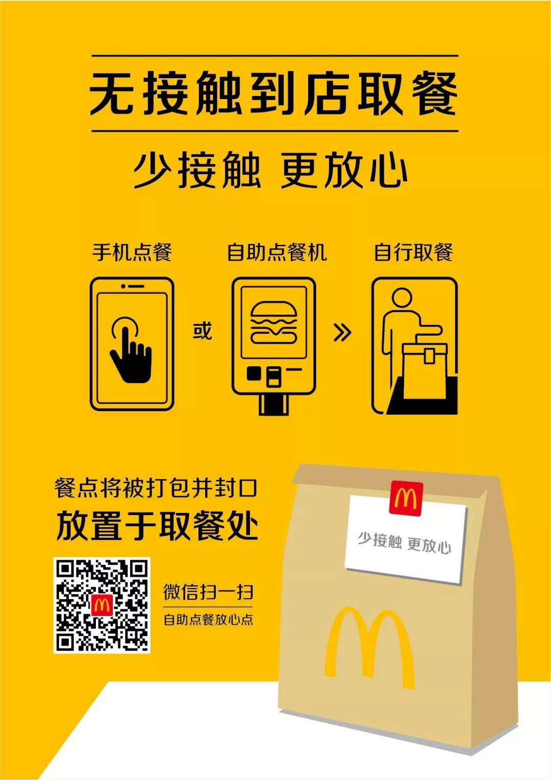 为了让顾客更放心,麦当劳在全国餐厅实施“无接触到店取餐”,减少点餐、取餐过程中的人际接触;顾客在手机、餐厅自助点餐机或柜台点餐后,无论堂食或外带,员工都会将制作好的餐点装入打包袋并封口,放置到取餐处,顾客可根据订单编号自行取餐。