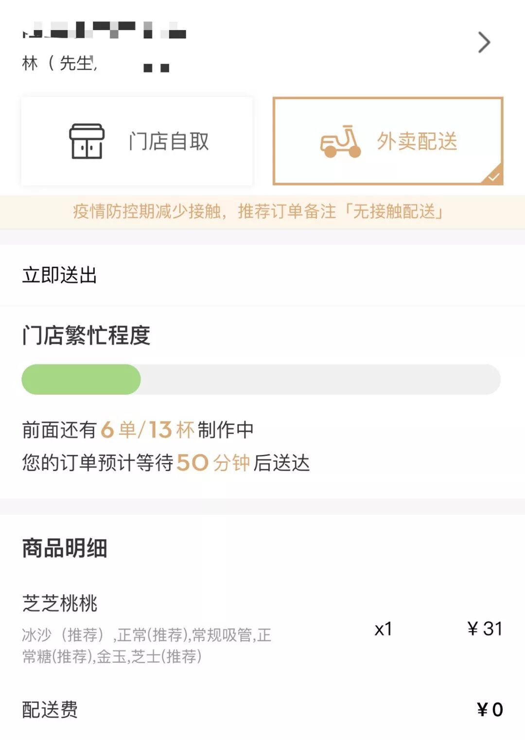 为了减少接触,门店取消了线下点单,只允许在微信小程序「喜茶GO」下单,贴心的喜茶还不忘提醒顾客下单时选择“无接触配送”,备注好地点,让骑手将茶饮放到指定位置。