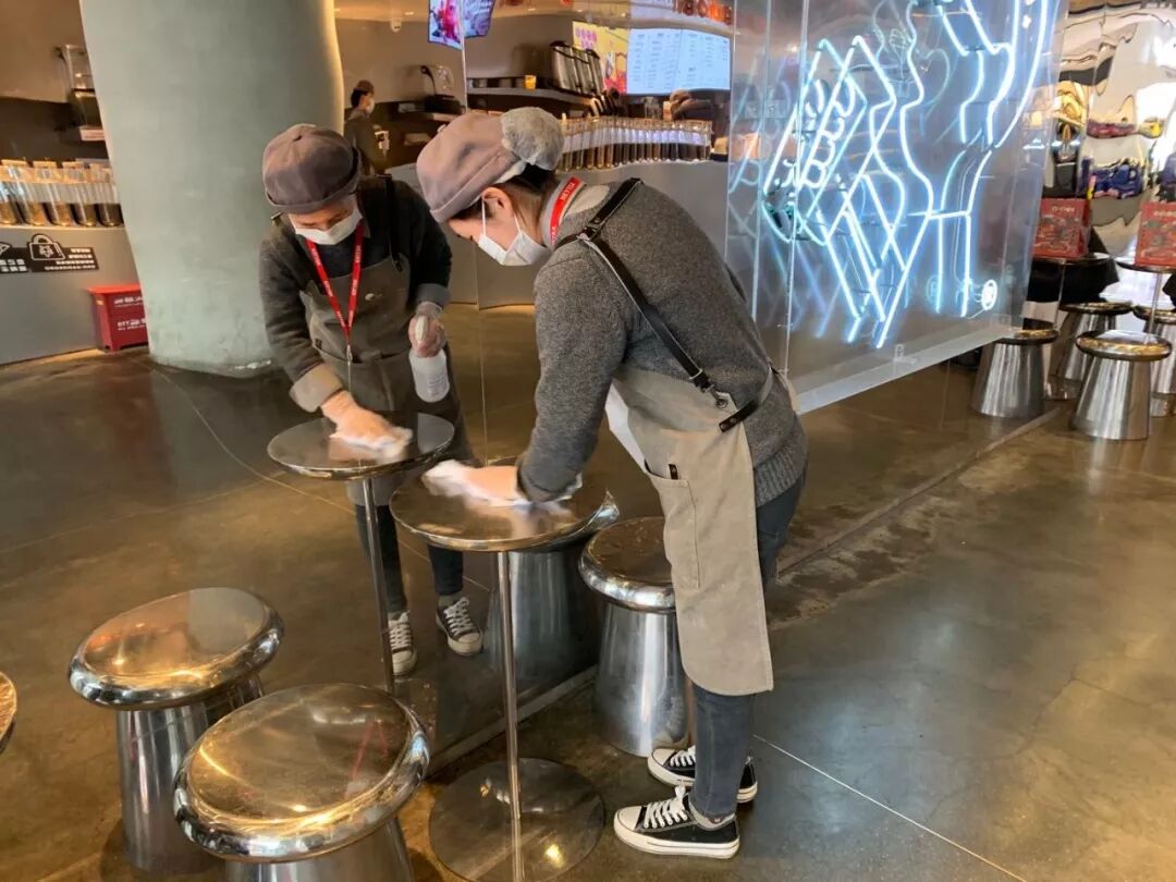 为确保店内卫生安全,店员每2小时就要对所有公共接触面进行清洁消毒,包括门把手、取餐区、桌椅……