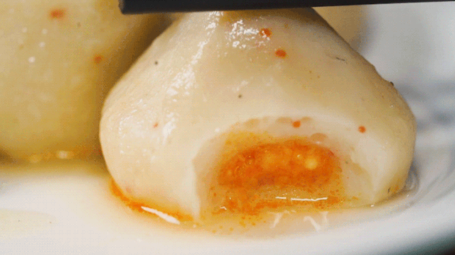 一口咬开,别看它皮厚又弹牙,内心爆汁出来的是黄澄澄金灿灿的鱼籽,着实让人迷恋~