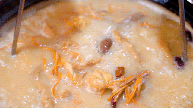 以猪大骨、老母鸡、精选药材作为底料,加入农夫山泉细火慢炖8小时,光听熬料都能想象得出这锅的鲜甜模样。