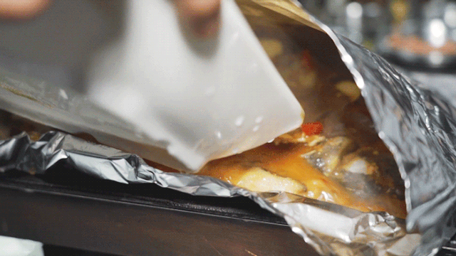 除了锡纸包鱼,还有一道鸦片鱼头也很上头,网夹直接翻烤,鱼肉外酥里嫩。