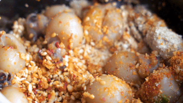 青春期最嫩的16岁,鸭血也是如此,粘附上芝麻与黄金豆的它,魅力也更足了~