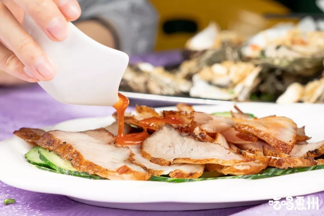 烤制好的猪颈肉切片装盘,配上“甜辣酱”闪亮登场,肉质鲜嫩,口劲适中不柴。