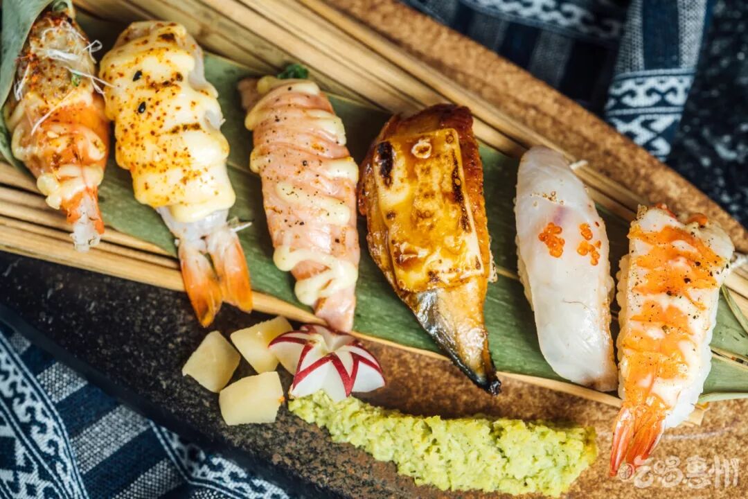 顾名思义,6款寿司组成:鹅肝酱北海道,芝士玻璃虾,黑椒三文鱼,盐烧海鱼,黑椒熟虾,芝士鳗鱼。
